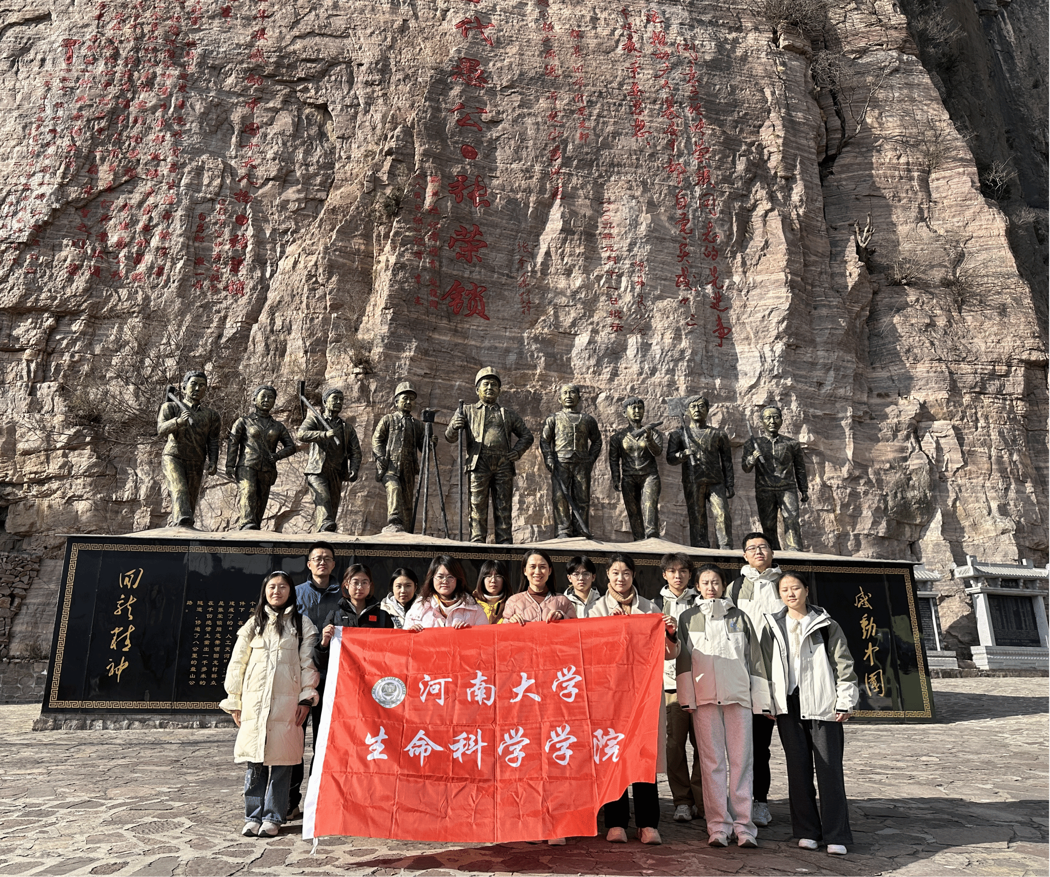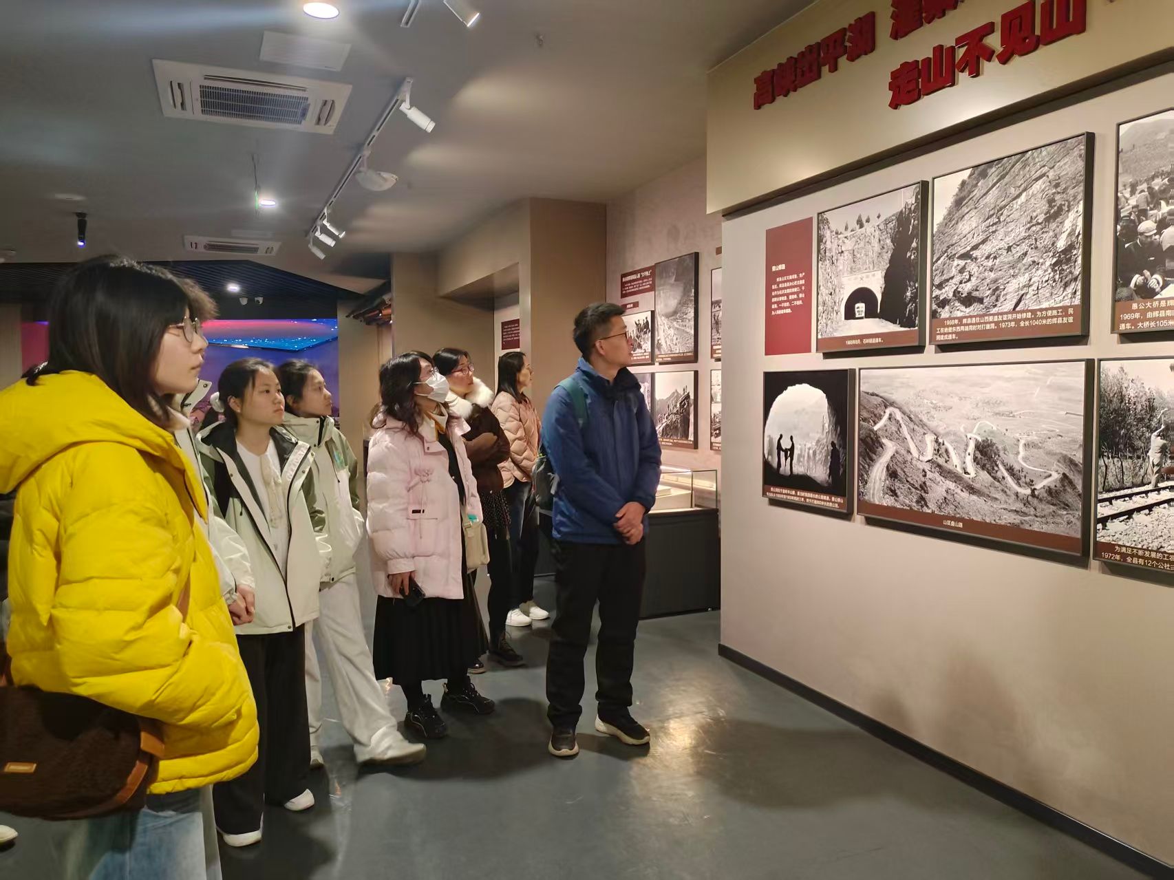 师生首先走进新乡南太行红色教育馆,以“红色太行·民族脊梁”为主题,沉浸式学习四大篇章内容,通过千余张图片、数万文献及数百实物,全景回顾党在新乡的百年奋斗史。馆内重点呈现了以回龙村党支部书记张荣锁为代表的“当代愚公”事迹。面对悬崖绝壁,张荣锁带领150名党员民兵,仅凭钢钎铁锤,餐风露宿,历时九年,硬是在悬崖上凿出一条长达9公里的“生命通道”——挂壁公路,彻底结束了村子与世隔绝的历史。这段鲜活的奋斗史,让师生们深刻体悟到中国共产党人“为有牺牲多壮志,敢教日月换新天”的坚定信念与无私奉献精神,对党的初心使命有了更为具象化的理解。