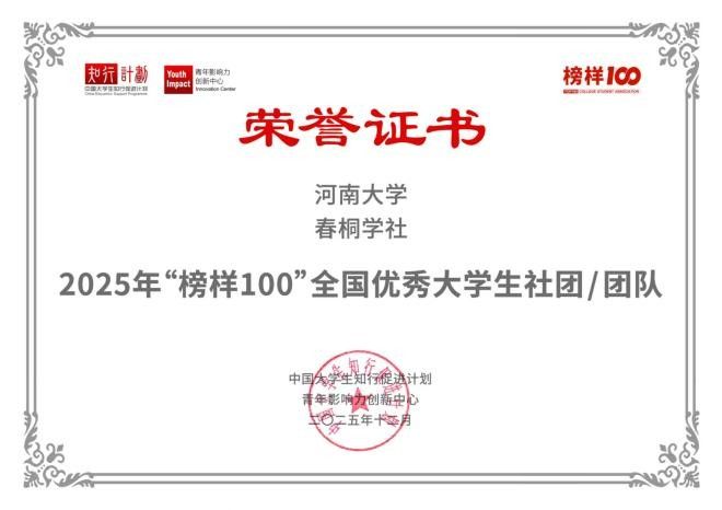 近日,在2025年“国际志愿者日”来临之际,中国大学生知行促进计划与青年影响力创新中心共同发布了2025年“榜样100”全国优秀大学生社团榜单。河南大学春桐学社脱颖而出,获评“全国优秀大学生社团”称号。