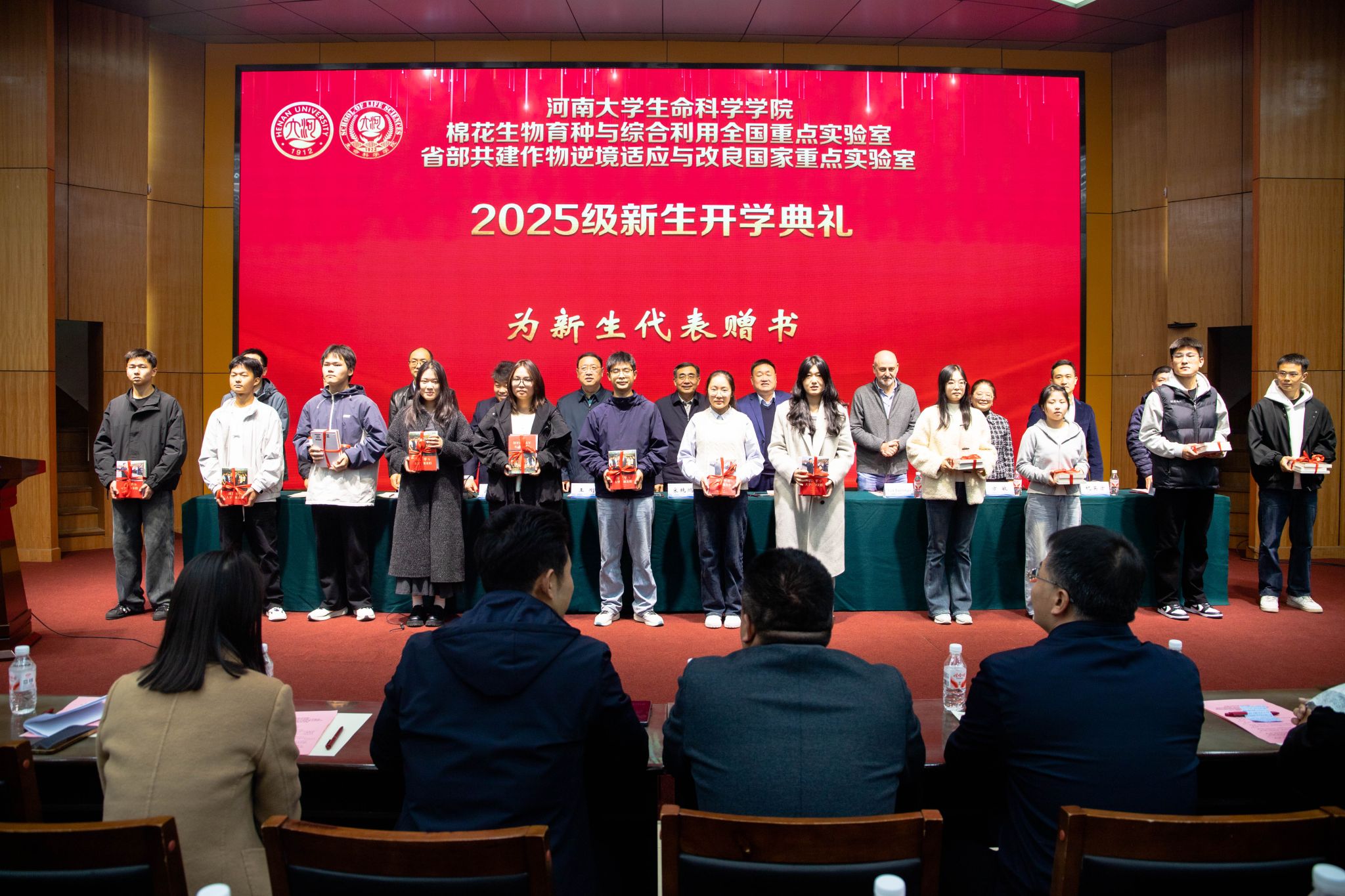 梁建忠在总结中讲到,河南大学生物学学科在宋纯鹏教授等一批追求卓越的生科人用智慧与汗水、拼搏与奉献铸就了今日的辉煌,形成了具有生科特色的优秀文化——在科研学术上追求“学无止境,境如生命”的境界,在学习工作中熔铸“脚踏实地,仰望星空”的精神,在人生成长中造就“艰苦奋斗,无私奉献”的品质。他鼓励同学们作为新时代的生科人,遇到困难和挑战就勇敢跨越,因为以作物逆境生物学为中心的学科群就是我们的特色和优势;遇到了支持和帮助,就感恩有加,涌泉相报,因为生科人有着更加丰富、高尚的情感和精神追求。在新的历史时期,同学们要躬身入局、主动担当,在学科、学校、国家需要的地方展现自己精彩的人生。随后,与会教师为新生代表们赠送书籍。