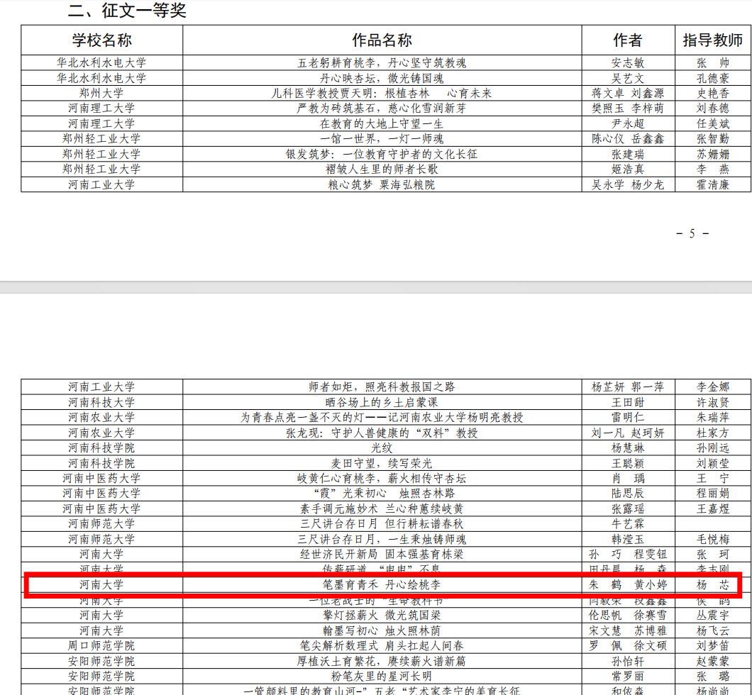 近日,河南省教育厅关心下一代工作委员会公布了2025年全省高校“读懂中国”活动评审结果。我院在此次活动中表现突出,推送作品荣获省级荣誉。其中,微视频作品《丹心化墨铸师道,沃野植根铸丰碑》荣获省级特等奖,征文作品《笔墨育青禾,丹心绘桃李》荣获省级一等奖,充分展现了学院在主题教育与实践育人方面的扎实工作与丰硕成果。