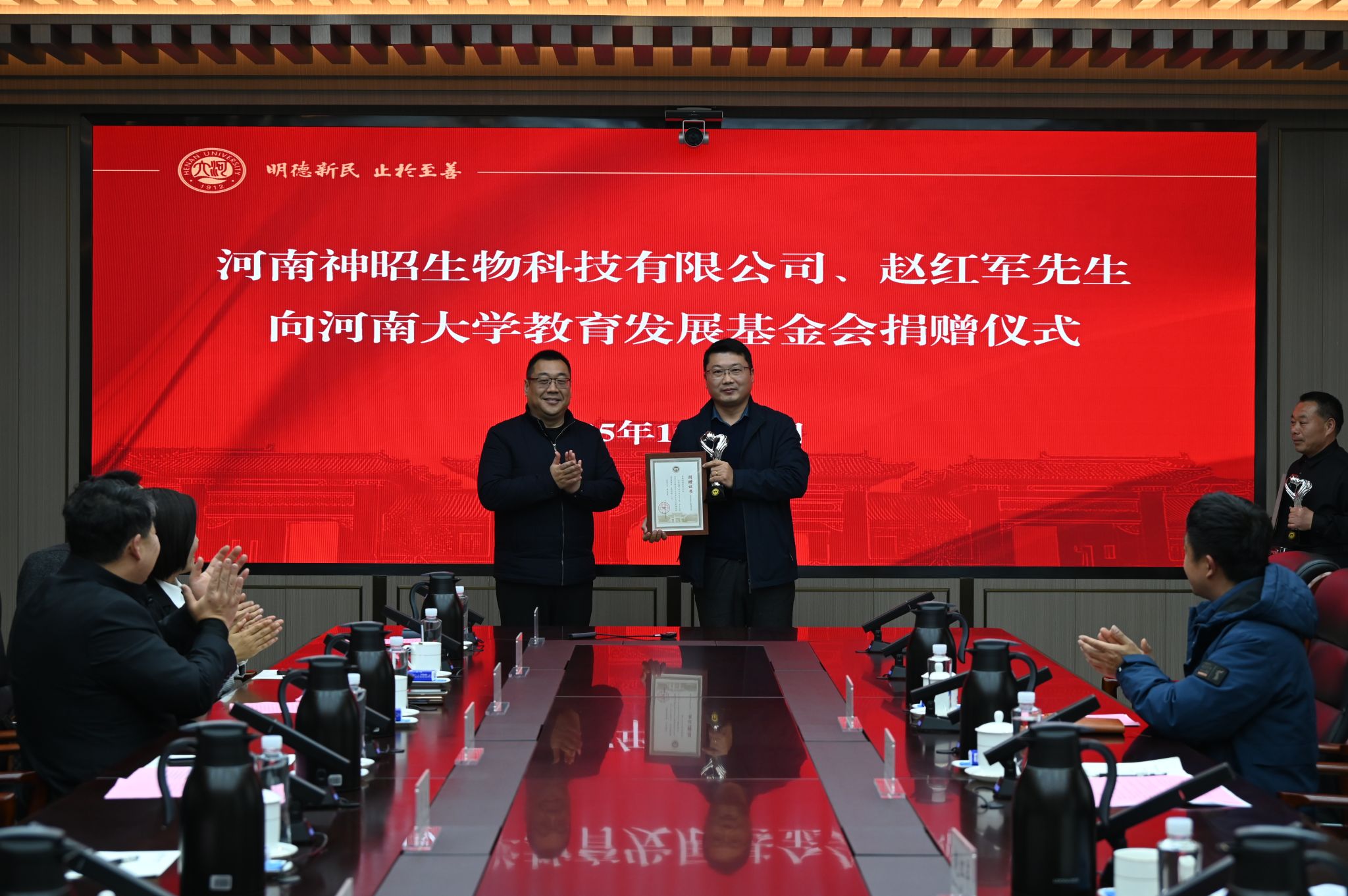 乔梁为捐赠方颁发捐赠证书及纪念杯。他在总结中指出,河南大学作为扎根中原大地的“双一流”建设高校,始终以服务国家战略需求为导向,以支撑区域经济社会发展为己任。近年来,学校通过动态优化学科生态体系,在生物医药、新型材料、人工智能等战略新兴领域形成特色优势,为高质量发展奠定了坚实基础。此次捐赠既是社会力量对学校办学方向的高度认同,更是推动产教融合的重要契机。他表示,期待通过校企深度融合,实现“需求对接、资源整合、优势叠加、成果共享”,为河南建设国家创新高地贡献智慧力量。