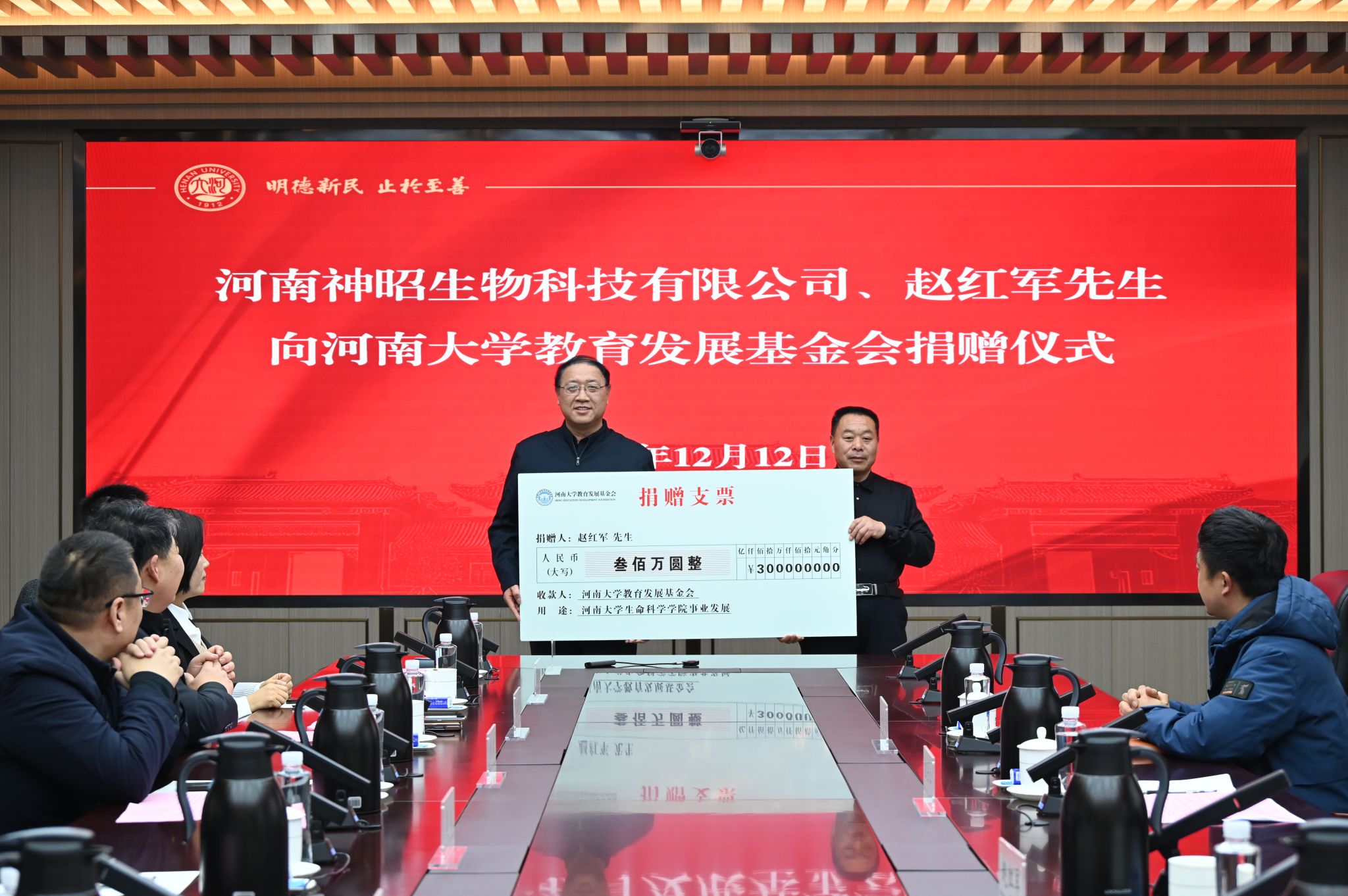 仪式上,刘婷代表河南大学教育发展基金会先后与河南神昭生物科技有限公司、赵红军先生签订捐赠协议,捐赠数额分别为500万元和300万元,王刚代表生命科学学院接受捐赠。