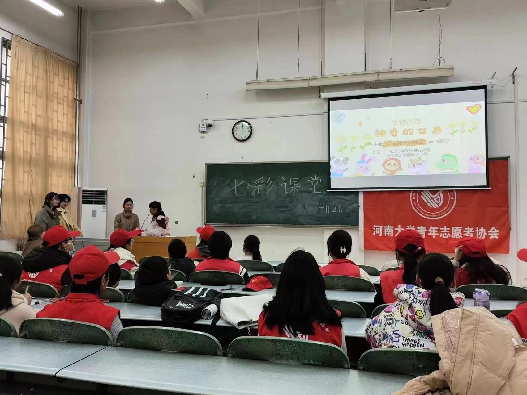 11月26日,生命科学学院青年志愿者协会结合专业特色,参与由校青协举办的“七彩课堂情满校园”志愿服务活动,在金明校区计算机报告厅为小朋友上了一堂生动的“生物奥秘”科普课。