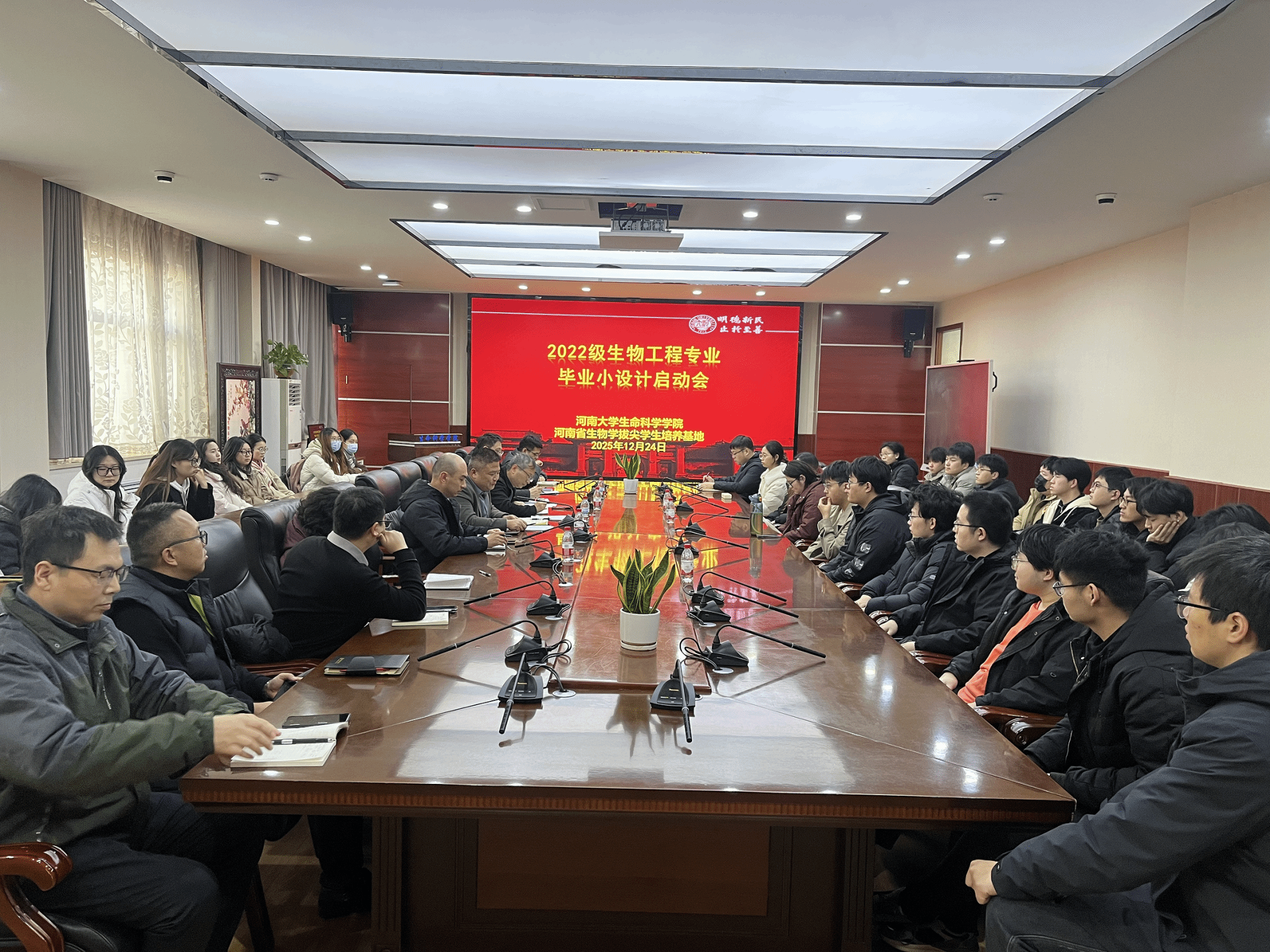 12月24日下午,生命科学学院生物工程专业毕业小设计工作动员会在学院B201会议室举行,副院长赵海鹏,生物工程系主任刘宇鹏,副主任李华,企业导师代表、成都英德生物医药设备有限公司研发总监靳魁奇,毕业小设计全体指导教师,2022级生物工程专业全体本科生参加动员会。会议由刘宇鹏主持。