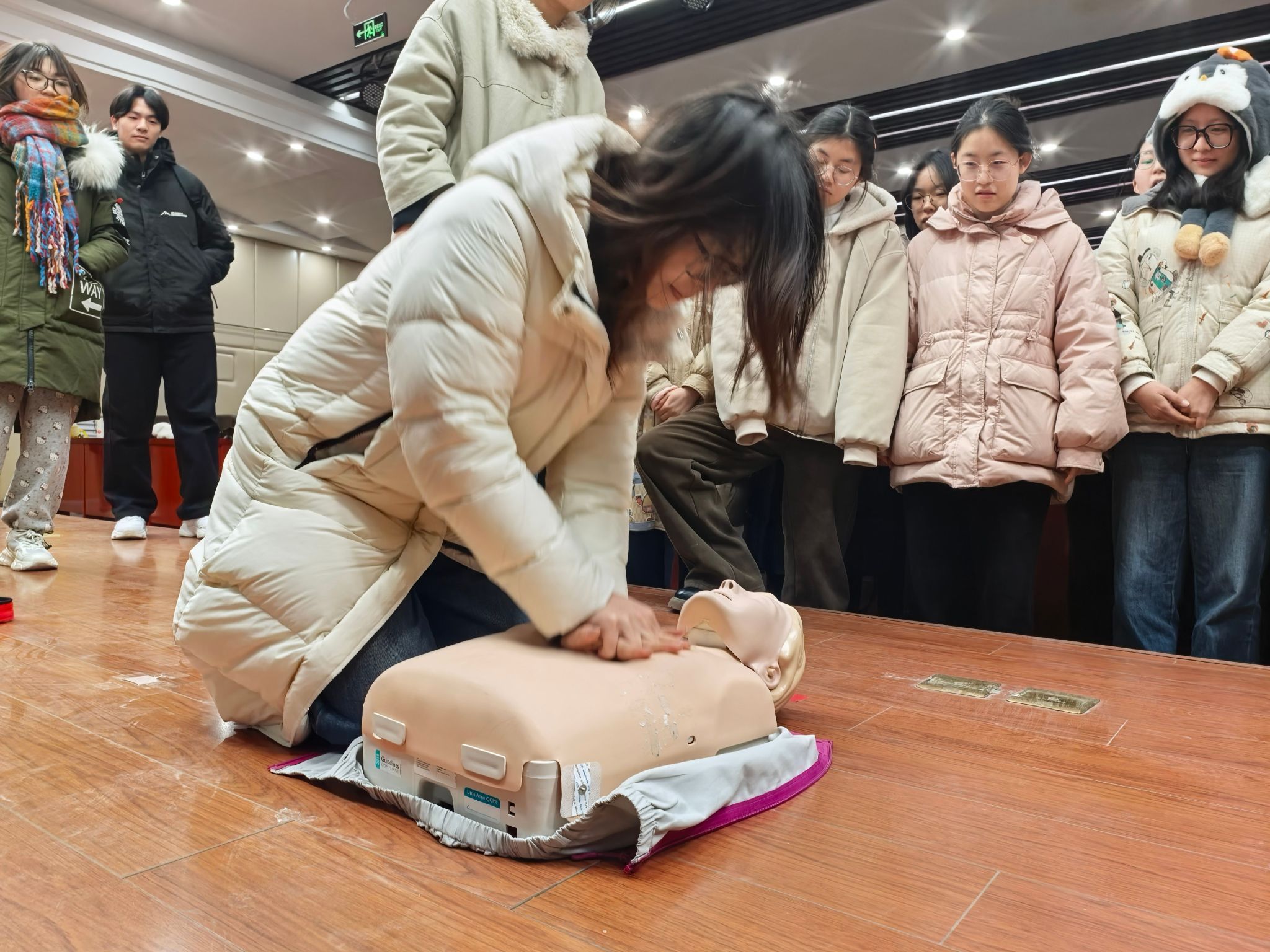 董淑娟以“我国每年约54万人发生心源性猝死”这一触目惊心的数据为导引,系统讲解了心脏功能、猝死病因及预防要点,尤其提醒年轻人警惕熬夜、情绪波动等高危因素。在实操环节,她现场演示了规范的心肺复苏流程与AED(自动体外除颤器)设备使用方法,指导学生进行模拟操作,有效提升了师生应对突发状况的急救能力。